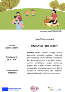 Pradedamas vykdyti projektas- Moterų asmeninio augimo klubas ,,Stiprios be baimės‘‘. Projekto tikslas- stiprinti Tauragės rajono moterų ir merginų asmeninį atsparumą negatyviems gyvenimo veiksniams (smurtas lyties pagrindu, nedarbas, krizinės gyvenimo situacijos). Projekto įgyvendinimo metu bus organizuojami teminiai klubo susitikimai vedami psichologo, teisininko, sveikatos edukatoriaus, priklausomybių ligų specialisto. Klubo narės mokinsis atpažinti savo emocijas, priežastis ir pasekmes,